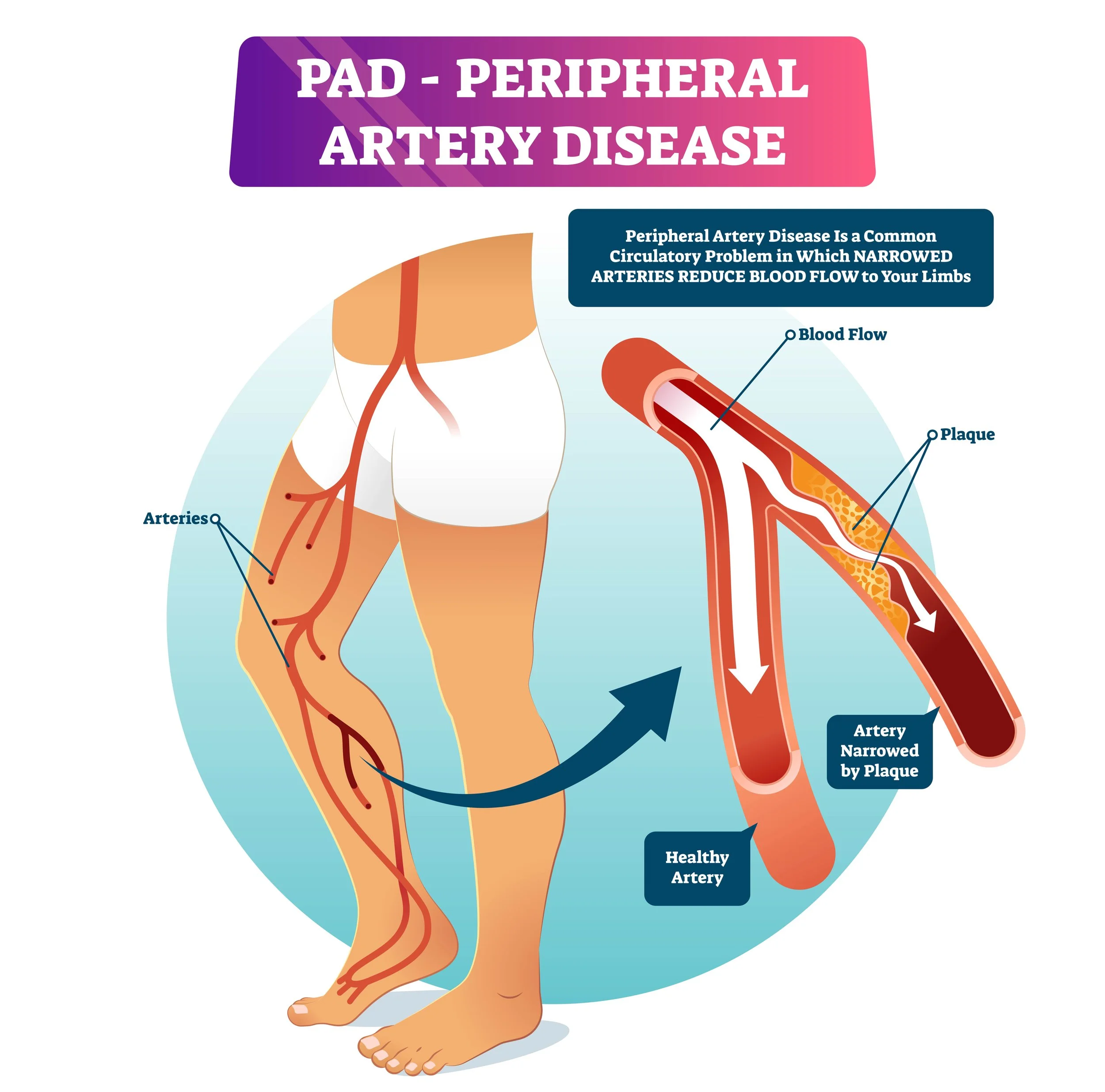 Lower extremity Peripheral Artery Disease (P.A.D.) is a common disease that decreases the blood flow in the arteries to the legs and feet. P.A.D. can cause: leg muscle fatigue, discomfort or pain when walking; diminish quality of life and independence; and can lead to amputation. All people with P.A.D. have a two to six-fold higher risk of death from heart attack and stroke.